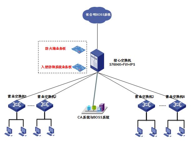本次方案配置1台S7604X,并配置防火墙板卡、入侵检测防护(IPS)板卡,实现内部网络数据转发业务、安全业务全面功能,防火墙板卡中通过设定相应的安全区域级别来实现访问控制,对内网以及服务器区域进行有效的区域隔离;同时为了能实现外网对内网的系统漏洞的攻击、蠕虫、木马、病毒、SQL注入、跨站脚本、协议异常、DDoS、扫描、网络滥用流量有效防护,将启用本次项目配备的入侵防御系统业务板卡的检测与防御功能。