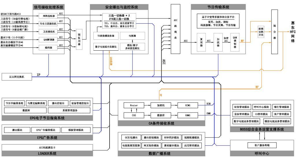 所有服务器做1+1热备份,采用专用存储设备存放数据,多种的容灾备份措施,确保数据安全。可实现业务受理、客户资源管理、计费及帐务管理、产品管理、业务流程管理、客户服务管理、资源管理、授权管理、查询统计、系统管理等功能,并且通过接口实现与其他系统的互联,以实现相应的功能。与其相连的外部系统主要有:条件接收系统、节目播出管理系统、VOD系统、客服系统、金融系统、数字电视监管平台、其他数字电视SMS、宽带计费网关、宽带认证、可寻址系统等。