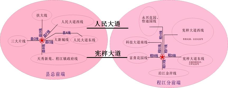 结合梅县城区实际情况,选择一环两星的网络拓扑结构(如下图),在程江收费站设置分前端,选择经人民大道和宪梓大道敷设两条光缆主干线路,与县中心机房构成一个环网,当其中一条线路出现故障时,光开关立即将信号切换至另一条通道,使信号保持畅通,网络具有了一定的自愈功能,这样保证了程江分中心机房安全稳定的运行。并且市有线电视网络接入信号分别从邱云桥及梅州大桥两个方向引入,保证了县中心机房信号的可靠性。