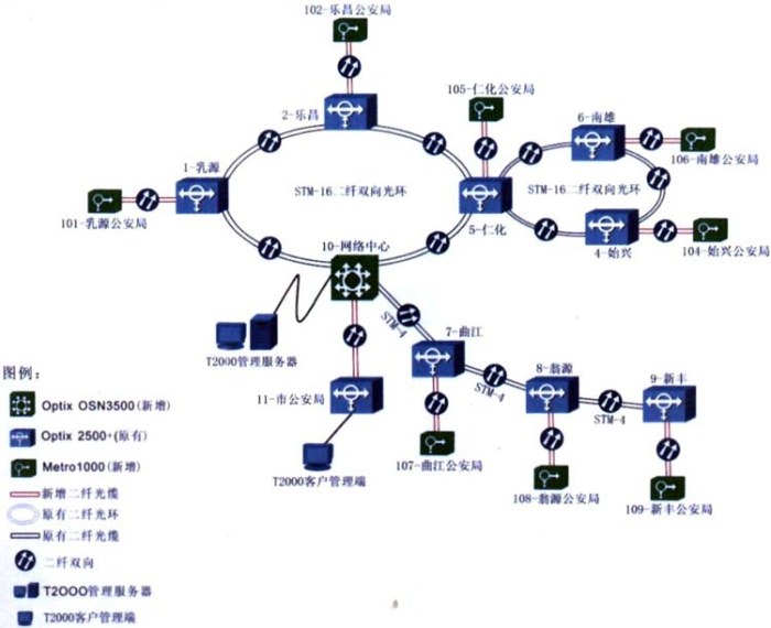 韶关广播电视台中心机房原有华为Metro 3000(2.5G)更换为OSN3500(10G),为以后网络升级至10G做准备同时将网络中心现已的Metro 3000转移至市公安局机房,作为其专网的汇集设备,保护已有投资,在曲江、翁源、新丰、仁化、南雄、始兴、乐昌、乳源各县(市、区)配置一台Metro 1000节点设备,并配置相应业务板卡。