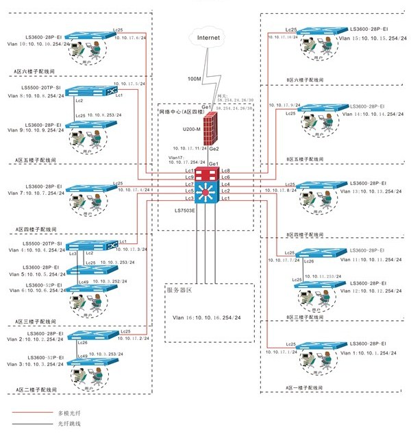 河源广播电视台内部局域网配置1台H3C- LS-7503E作为交换核心,通过NS-SecPath U200-M-AC安全连接100Mbps接入公网,内部采用2台LS-5500-20TP-SI-H3、11台LS-3600-28P-EI及2台LS-3600-52P-EI作为终端接入设备,可满足400多个终端接入要求,并具备一定的冗余,满足将来扩容需求。