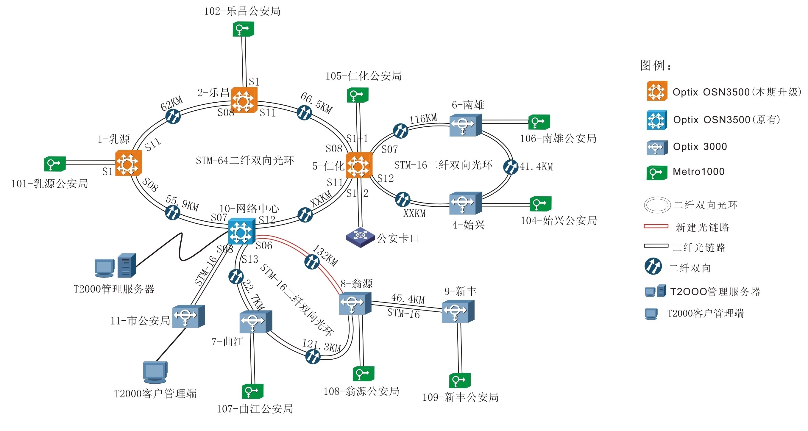 由于现有网络设备已进入老化状态,影响业务的稳定运行,而且Optix2500+已停产多年,无法找到备板和备件。为了保障市县SDH网络的健壮性与稳定性及未来业务发展的需要,韶关分公司本期工程将网络中心OSN3500网元连接乳源和仁化的光板升级为10G的光板接口板,把乳源、乐昌、仁化三个机房的2.5G的Optix2500+设备升级成10G的0SN3500设备,与网络中心OSN3500网元组成10G MSTP环,南雄、始兴保留Optix2500+设备,与仁化OSN3500网元组成2.5G MSTP环,并增加韶关至翁源STM-16双纤链路,使韶关-曲江-翁源组成2.5G环。另外,在韶关中心机房、乳源、乐昌、仁化广电机房新建一套中兴电源ZXDU58 S151电源,为新建OSN3500提供动力支持,提高系统可靠性。